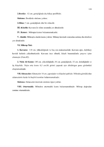 V. Alınlık: Mihrapta alınlık kısmı yoktur. Mihrap üzerinde sonradan asılmış dua kitabesi