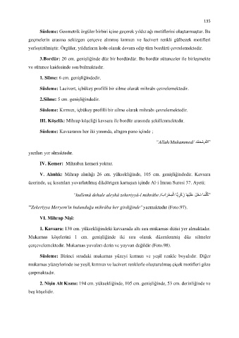 V. Alınlık: Mihrap alınlığı 26 cm. yüksekliğinde, 105 cm. genişliğindedir. Kavsara
