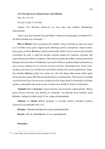 Yapıdaki Yeri ve Konumu: Yapının harimine giriş kuzeyden sağlanmaktadır. Mihrap