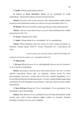 V. Alınlık: Mihrap alınlığı 40 cm. yüksekliğinde, 247 cm. genişliğindedir.
