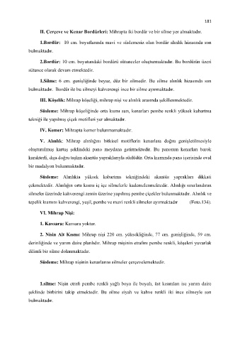 II. Çerçeve ve Kenar Bordürleri: Mihrapta iki bordür ve bir silme yer almaktadır.