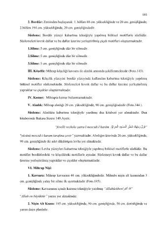 V. Alınlık: Mihrap alınlığı 20 cm. yüksekliğinde, 90 cm. genişliğindedir (Foto.144 ).