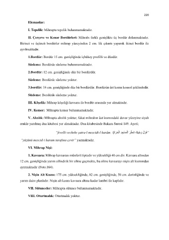 II. Çerçeve ve Kenar Bordürleri: Mihrabı farklı genişlikte üç bordür dolanmaktadır.