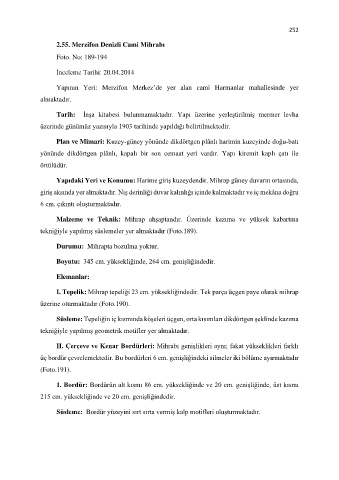 Yapıdaki Yeri ve Konumu: Harime giriş kuzeydendir. Mihrap güney duvarın ortasında,