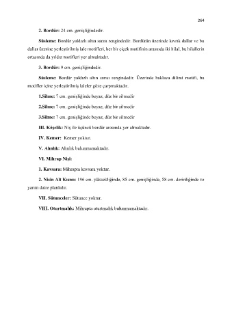 Süsleme: Bordür yaldızlı altın sarısı rengindedir. Üzerinde baklava dilimi motifi, bu