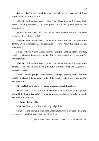 Süsleme: Bordür yüzeyi alçak kabartma tekniğiyle yapılmış geometrik şekillerden