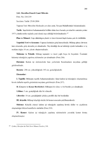 II. Çerçeve ve Kenar Bordürleri: Mihrapta bir silme ve bir bordür yer almaktadır.